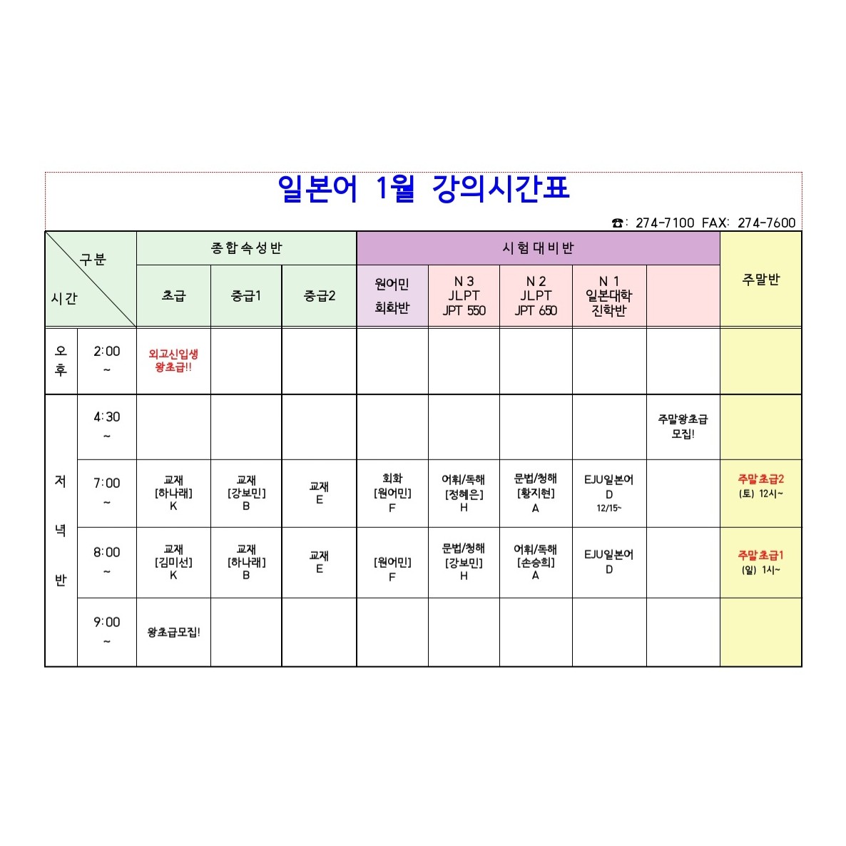 일본어 1月 강의시간표